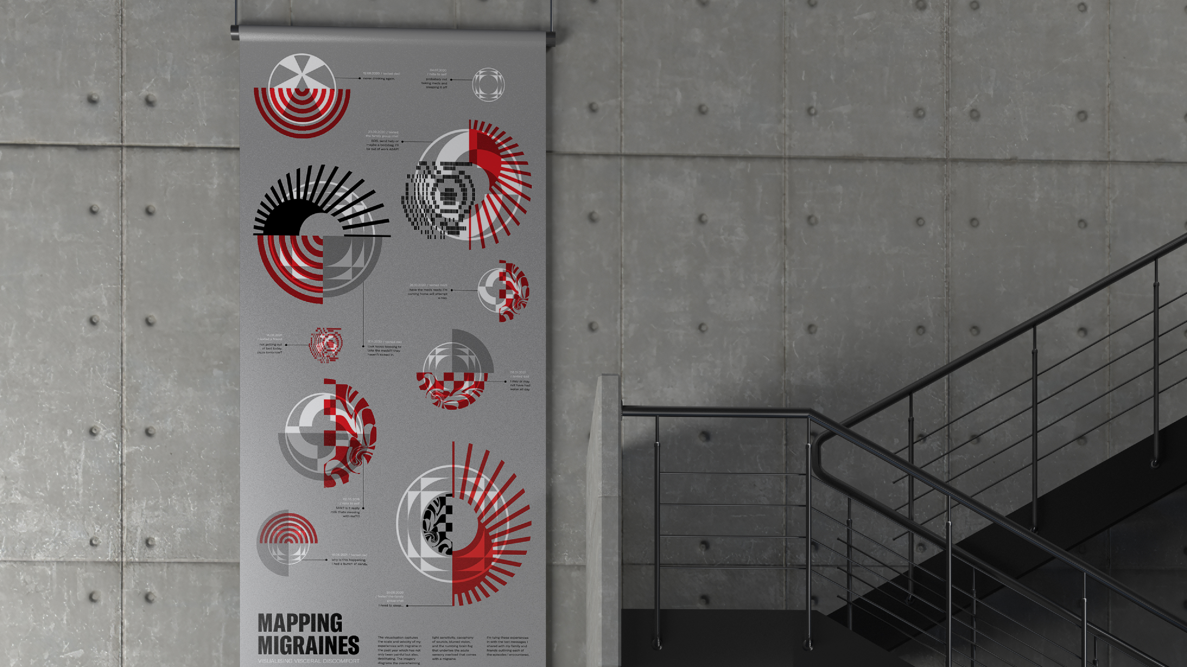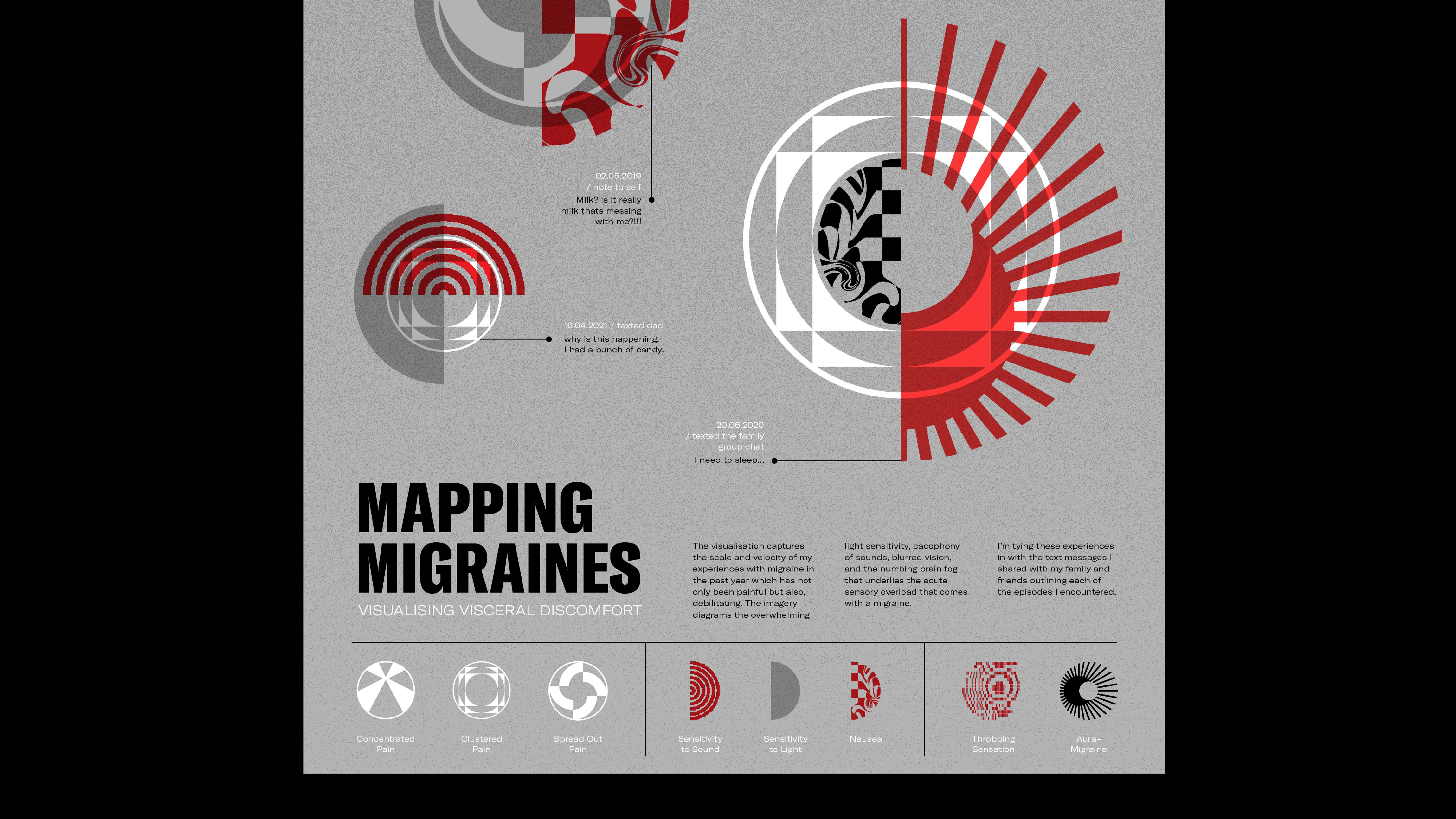 The visualization captures the scale and velocity of my experiences with migraine in the past year which has not only been painful but also, debilitating. The imagery diagrams the overwhelming light sensitivity, cacophony of sounds, blurred vision, and the numbing brain fog that underlies the acute sensory overload that comes with a migraine.